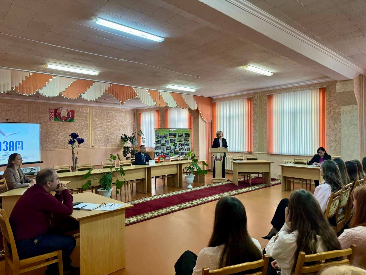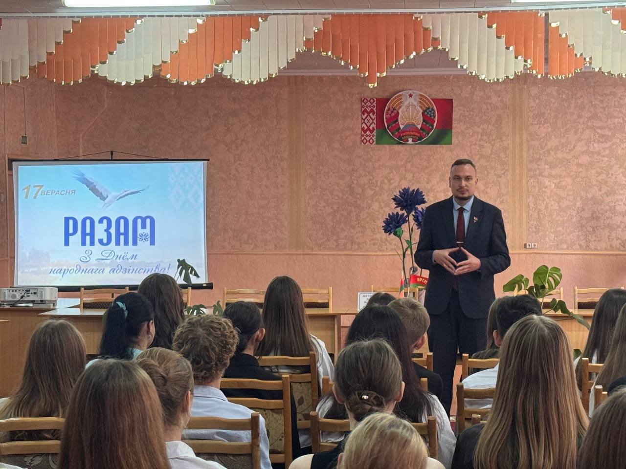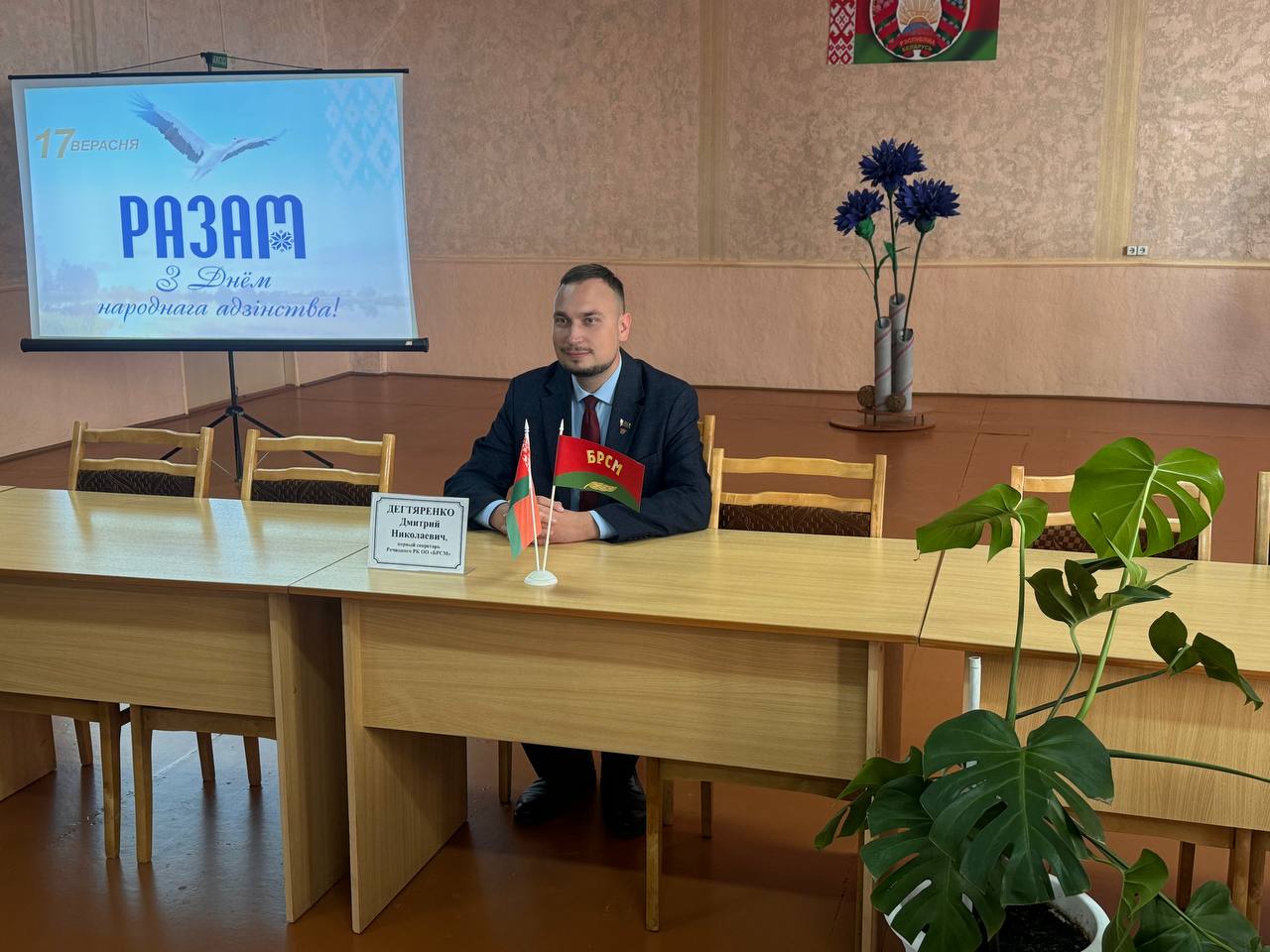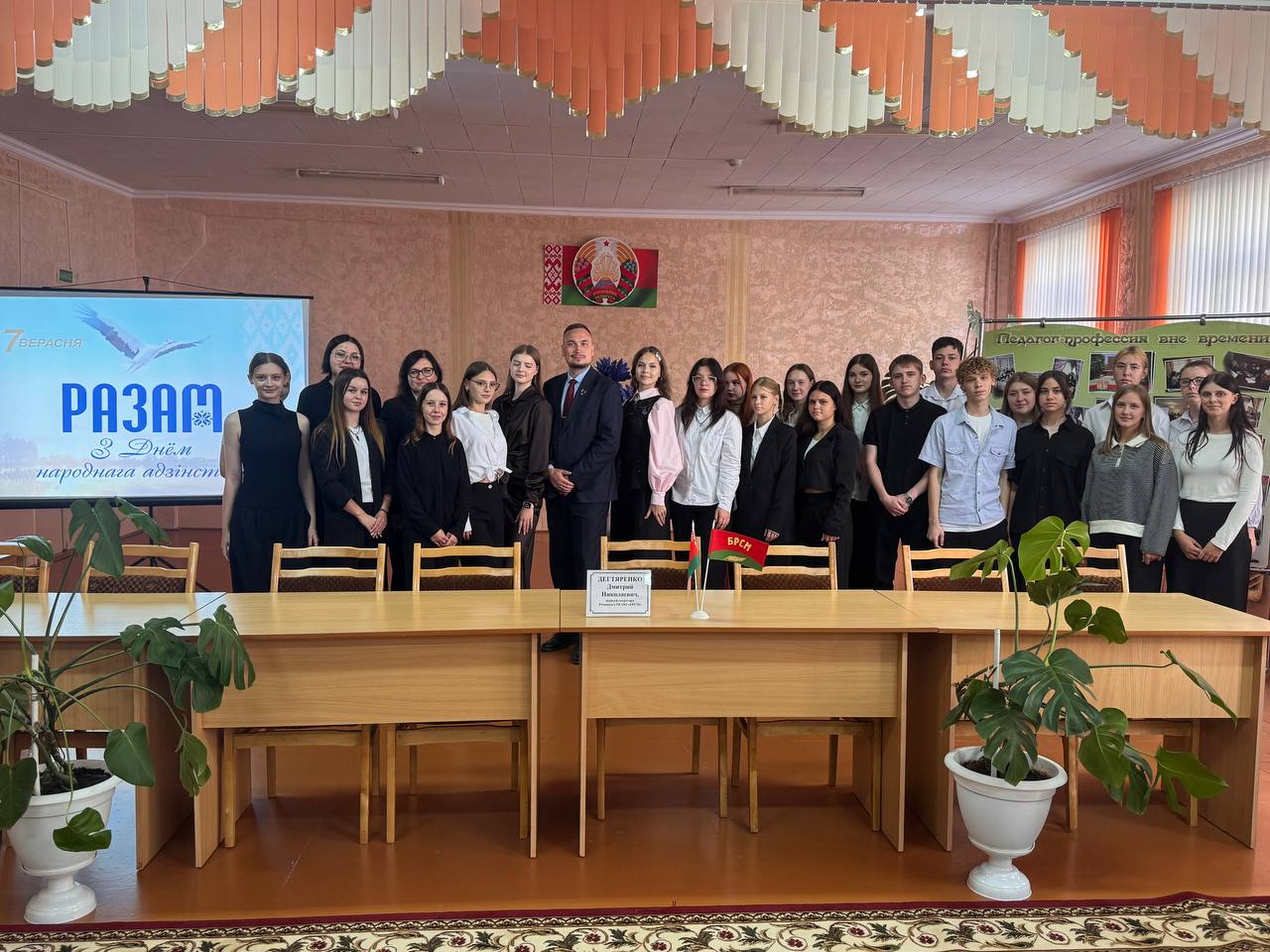 Сегодня прошло ещё одно важное мероприятие, посвященное Дню народного единства, - диалоговая площадка с представителями общественных организаций ОО "Белая Русь" и ОО "БРСМ". Представитель ОО "Белая Русь", Егорова Л.А., рассказала историю возникновения праздника: по инициативе Всебелорусского народного собрания Президент Республики Беларусь 7 июня 2021 издал Указ об учреждении 17 сентября Дня народного единства - праздника, проходящего под лозунгом «Единство. Развитие. Независимость».