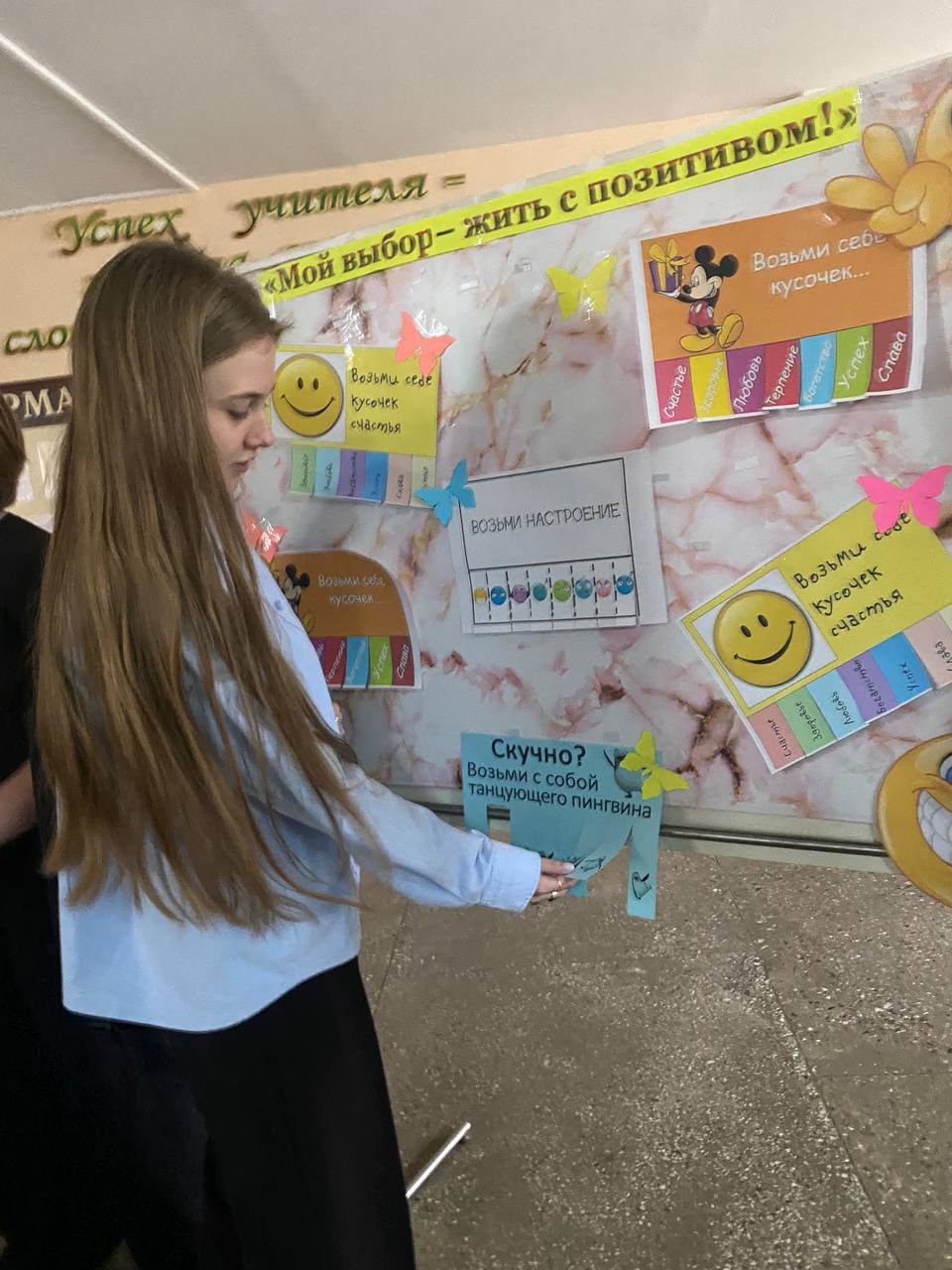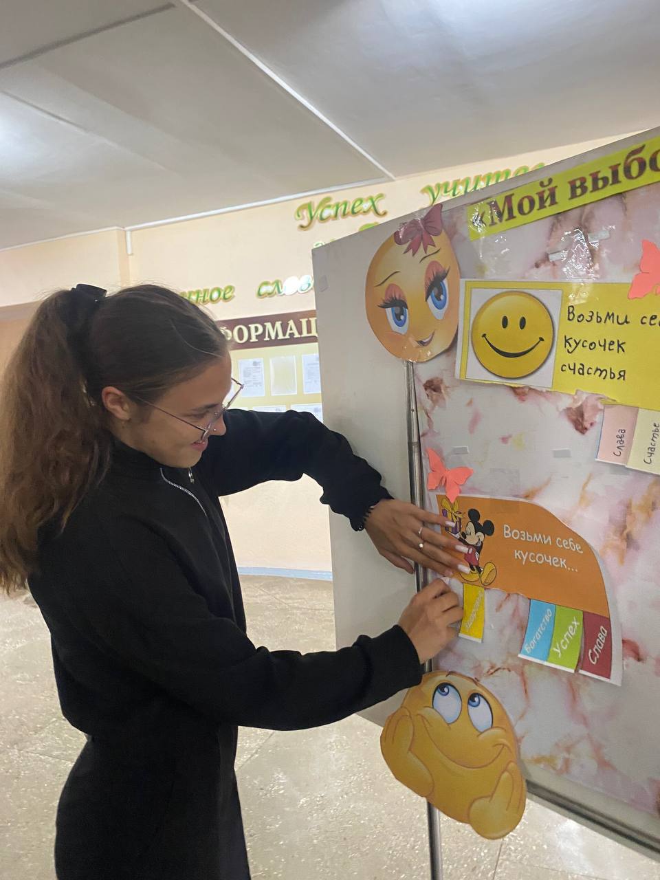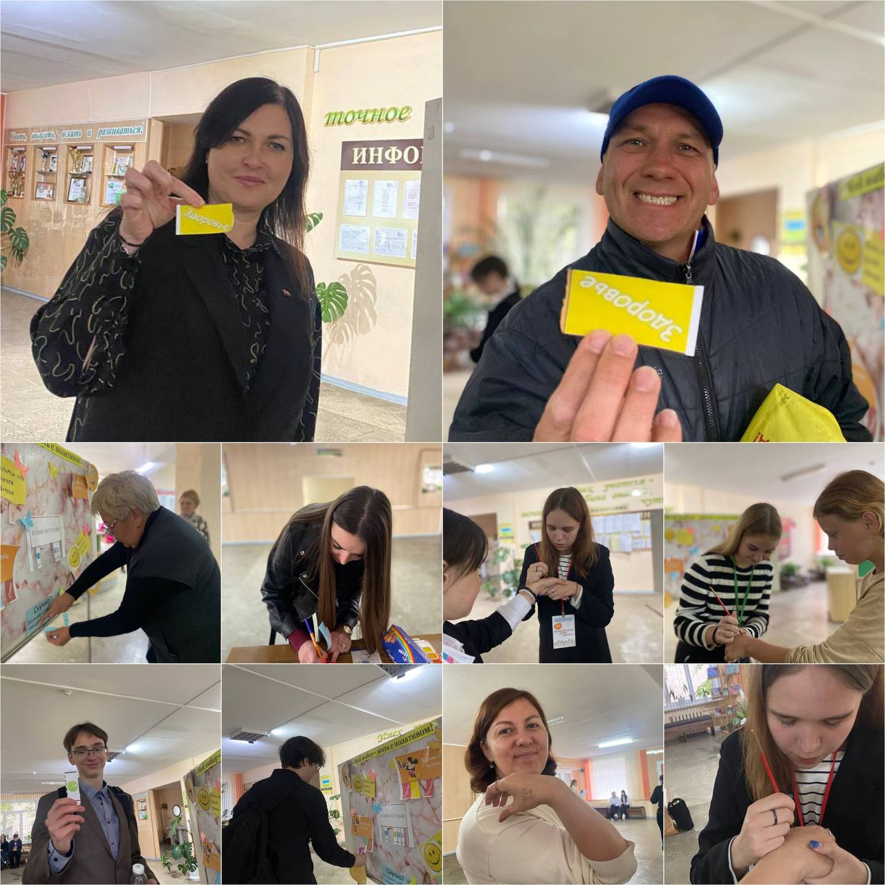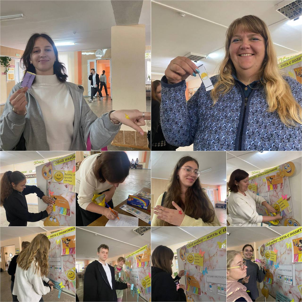 На переменах работали площадки: «Я люблю жизнь!» – позитивные художники с помощью красок и кисточки рисовали на руках солнце, сердечки, улыбки; предлагалось заполнить «Книгу добрых пожеланий», на стенде «Поляна настроения» желающие могли взять с собой мотивирующие фразы, помогающие поддерживать позитивный настрой и веру в себя. В фойе колледжа работал «Солнечный фотограф», который ждал учащихся, чтобы сделать позитивное фото.