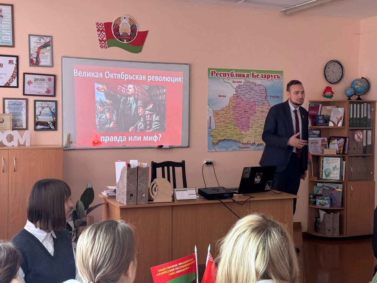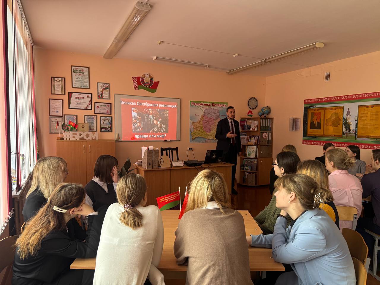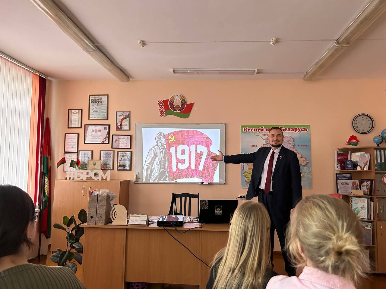 6 ноября накануне Дня Октябрьской революции в педагогическом колледже прошло увлекательное мероприятие с учащимися III курса, организованное первым секретарем районной организации ОО «БРСМ» . Разделившись на две команды «Большевики» и «Октябристы», ребята отвечали на вопросы, связанные с личностями и событиями Октябрьской революции.
