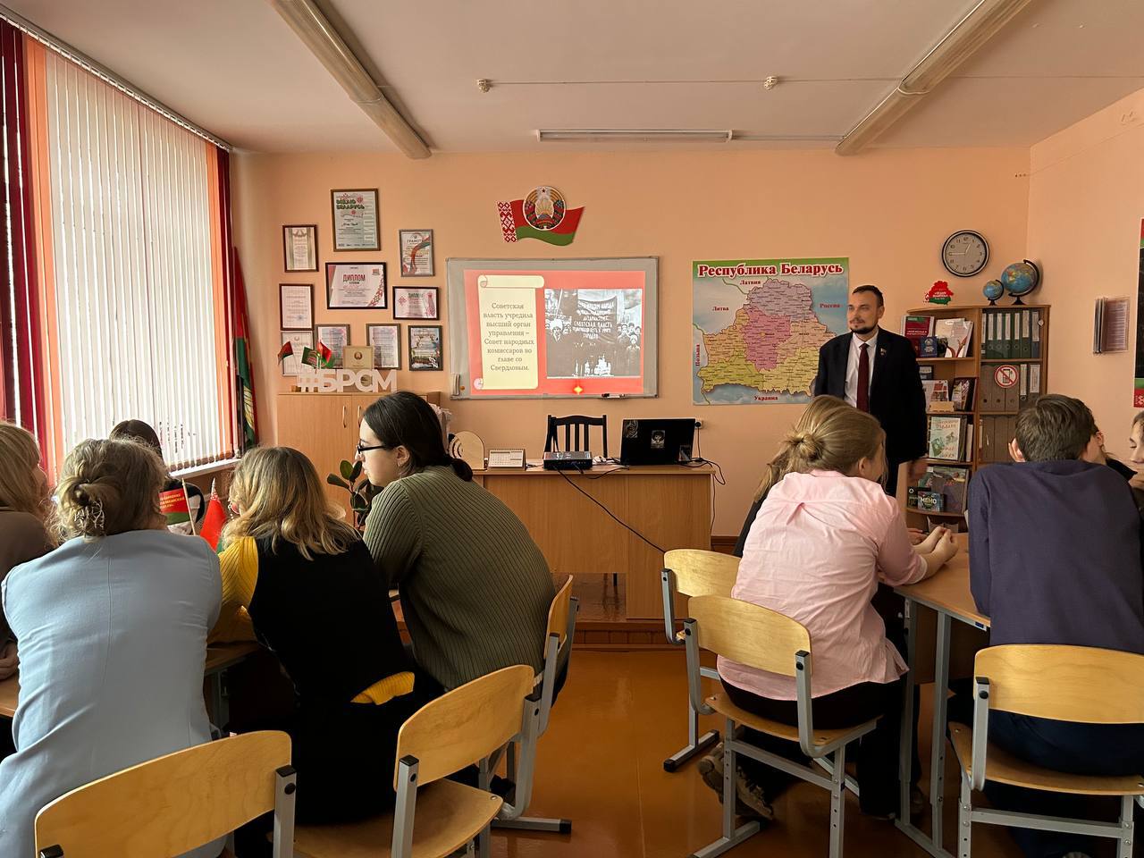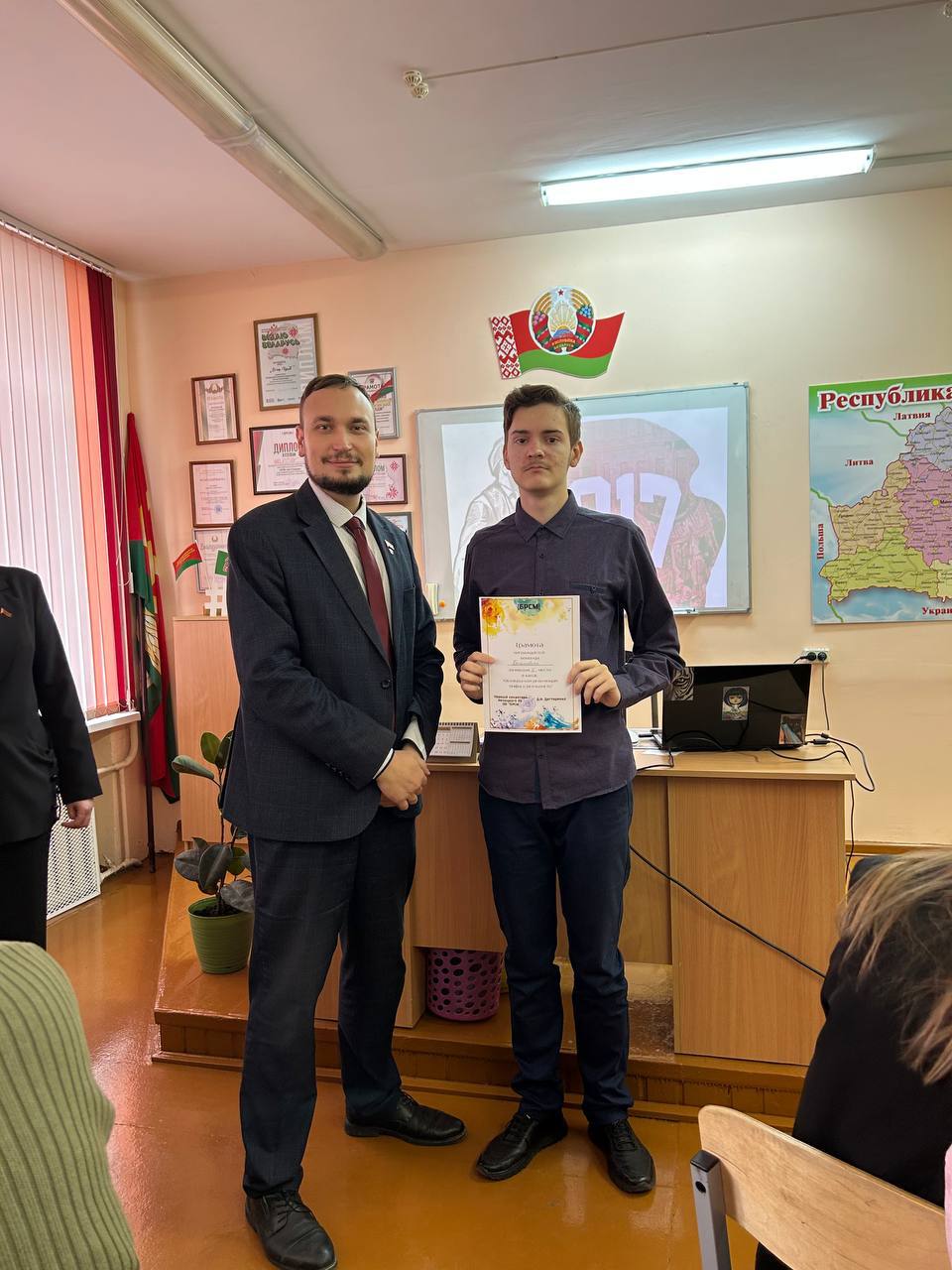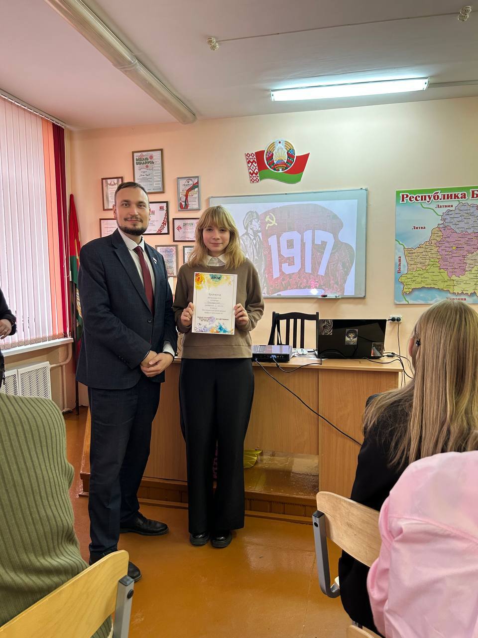 6 ноября накануне Дня Октябрьской революции в педагогическом колледже прошло увлекательное мероприятие с учащимися III курса, организованное первым секретарем районной организации ОО «БРСМ» . Разделившись на две команды «Большевики» и «Октябристы», ребята отвечали на вопросы, связанные с личностями и событиями Октябрьской революции.