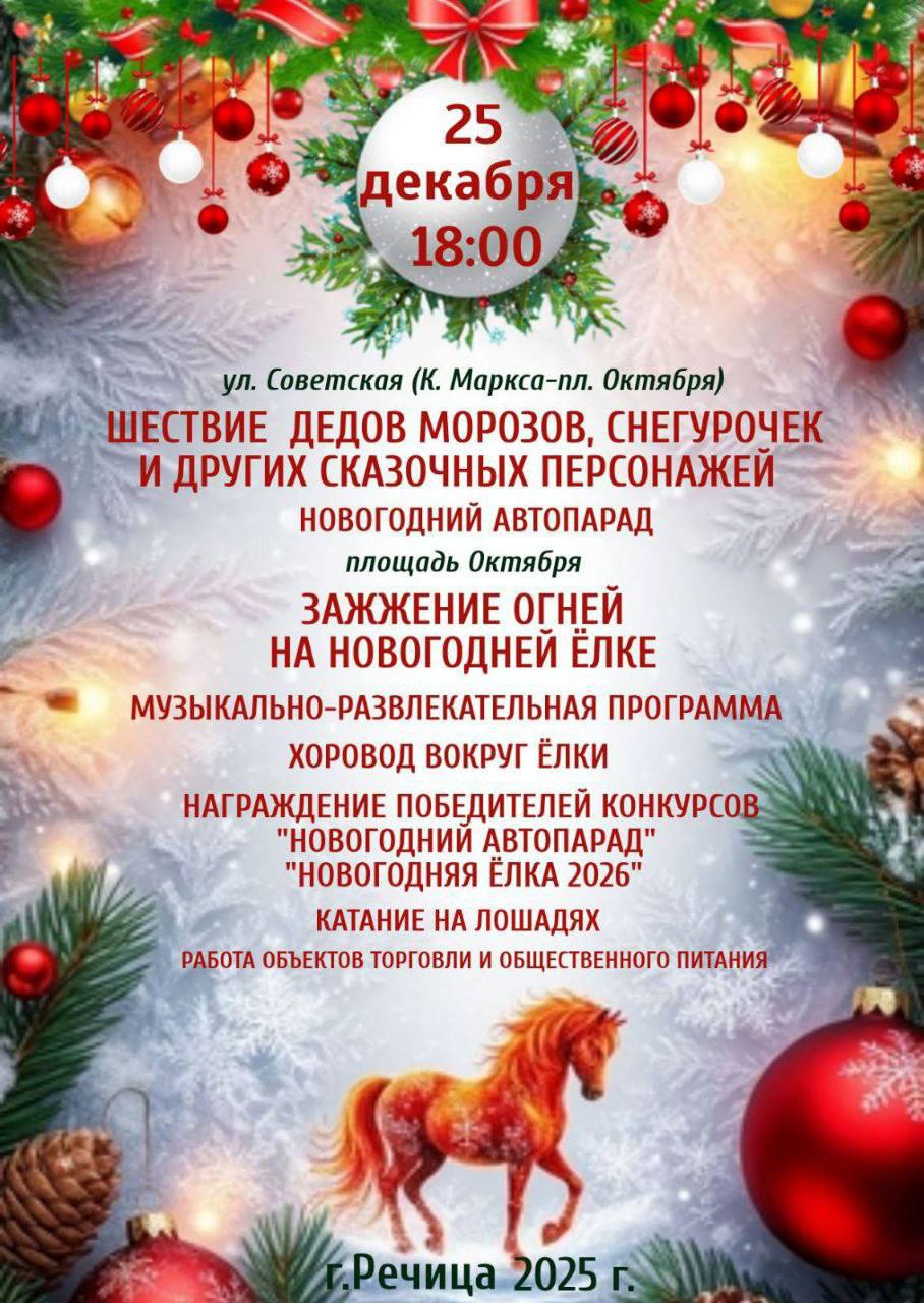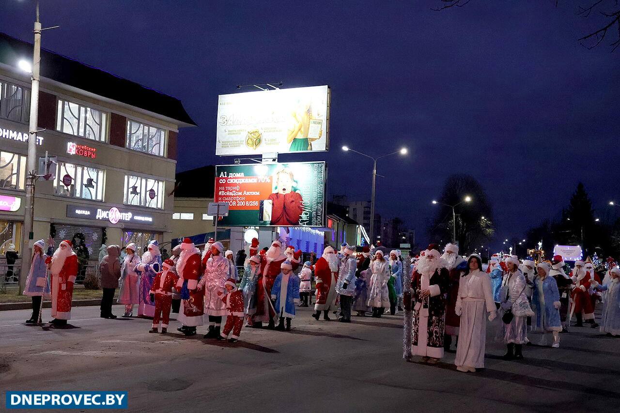 Событие, которое собрало 25 декабря в центре Речицы тысячи зрителей: новогоднее шествие Дедов Морозов и Снегурочек дало старт веренице новогодних торжеств - зажгли огни на главной елке города, поводили хороводы, детишки поучаствовали в театрализованном представлении.