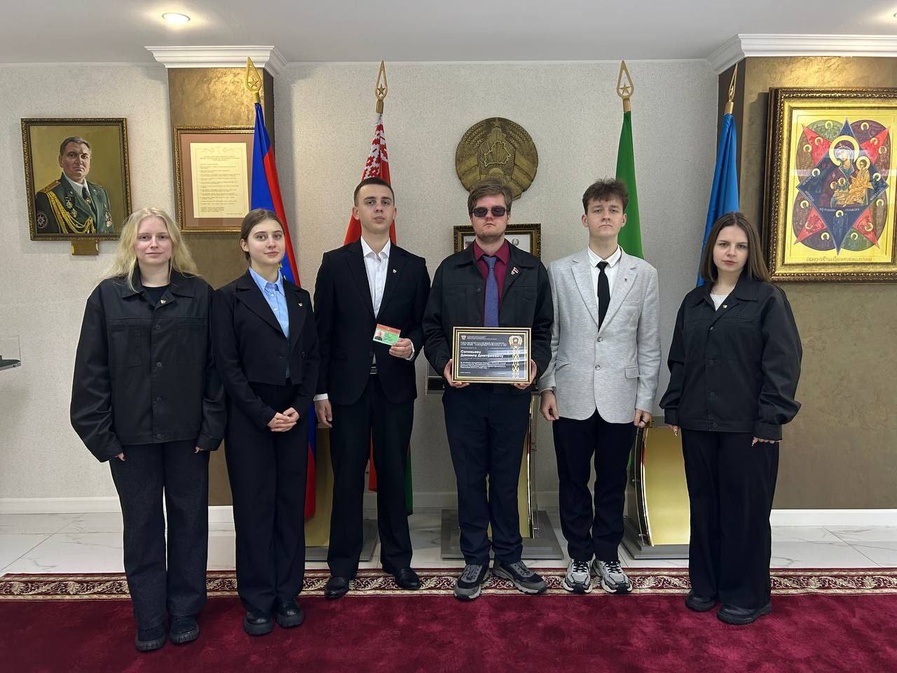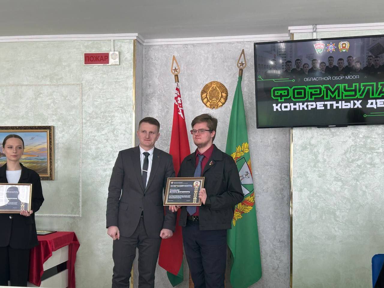 Особое внимание уделили тем, кто уже делом доказал свою преданность движению. Благодарностью Гомельского областного комитета ОО «БРСМ» за активный вклад и развитие молодежного правопорядка был награжден учащийся нашего педагогического колледжа — Соловьев Даниил.