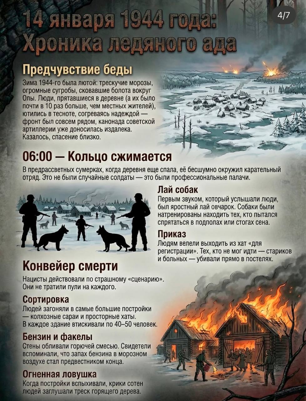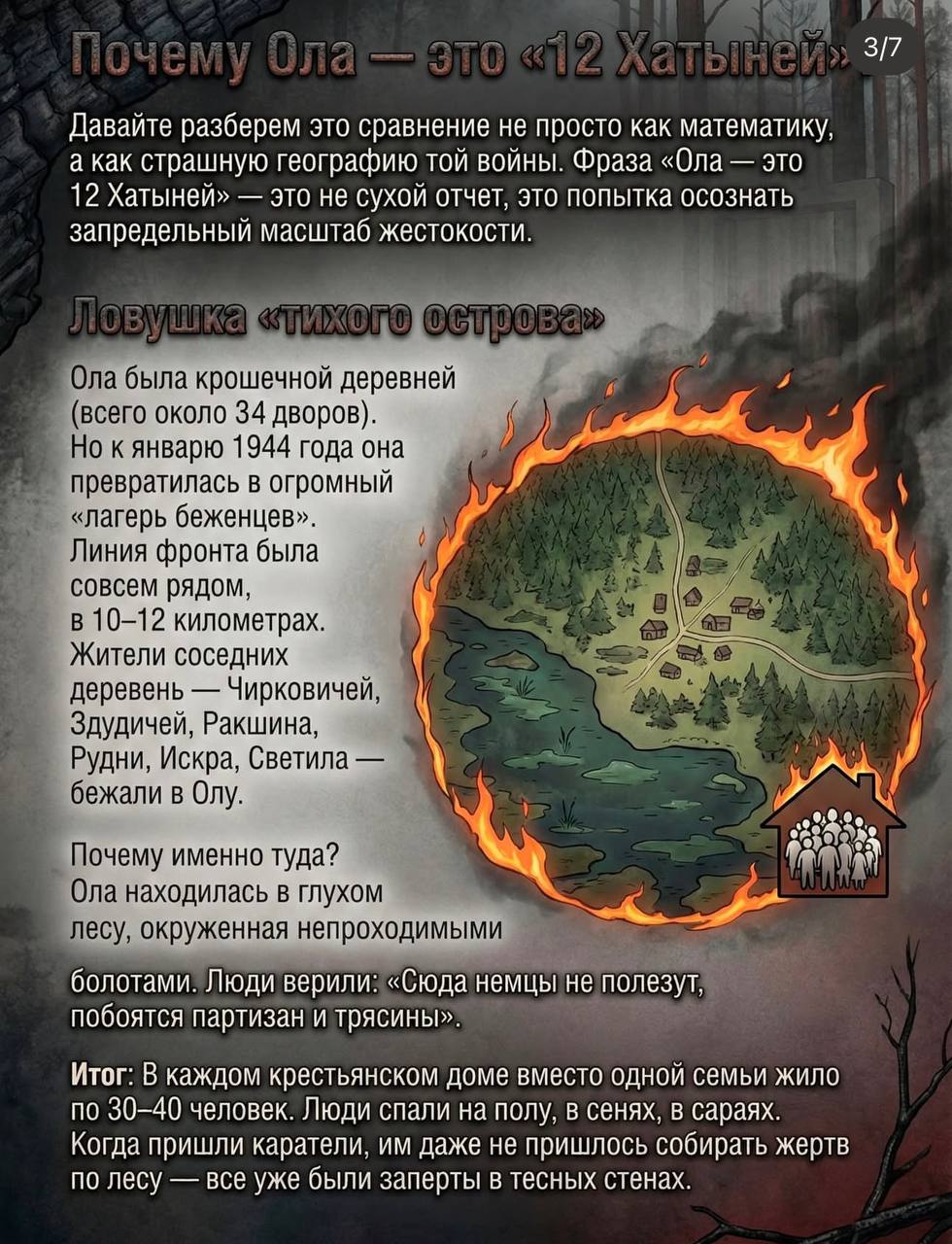В 1944 году фашистские каратели сожгли заживо более 1700 мирных жителей, включая стариков, женщин и сотни детей. Ола разделила страшную судьбу Хатыни, но до сих пор остаётся менее известной, хотя масштаб трагедии здесь был куда больше.
